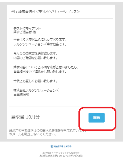 ②メール本文右下の「閲覧」をクリックすると、請求書がご確認頂けます。